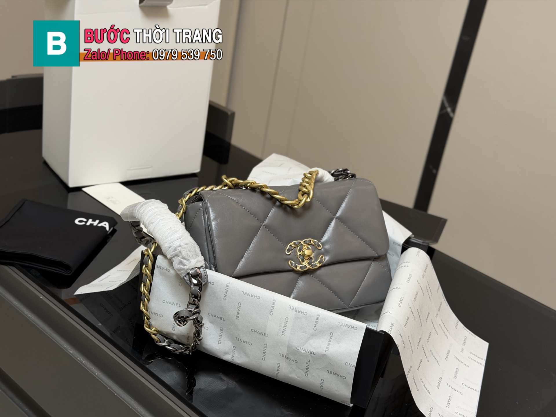 Chiếc Chanel 19 da cừu trắng với logo vàng nổi bật mang đến vẻ mềm mại, nhẹ tay và sang trọng đặc trưng. Chất liệu da cừu mềm mịn kết hợp họa tiết đại quilt tạo nên diện mạo trẻ trung nhưng vẫn đầy khí chất. Thiết kế hỗ trợ ba kiểu đeo linh hoạt: đeo chéo, đeo vai hoặc cầm tay. Dây đeo phối ba tông kim loại cổ điển giúp chiếc túi trở nên nổi bật hơn bao giờ hết. Đây cũng là mẫu được nhiều ngôi sao và đại sứ Chanel yêu thích. Kích thước 26cm, đi kèm trọn bộ hộp quà tặng.