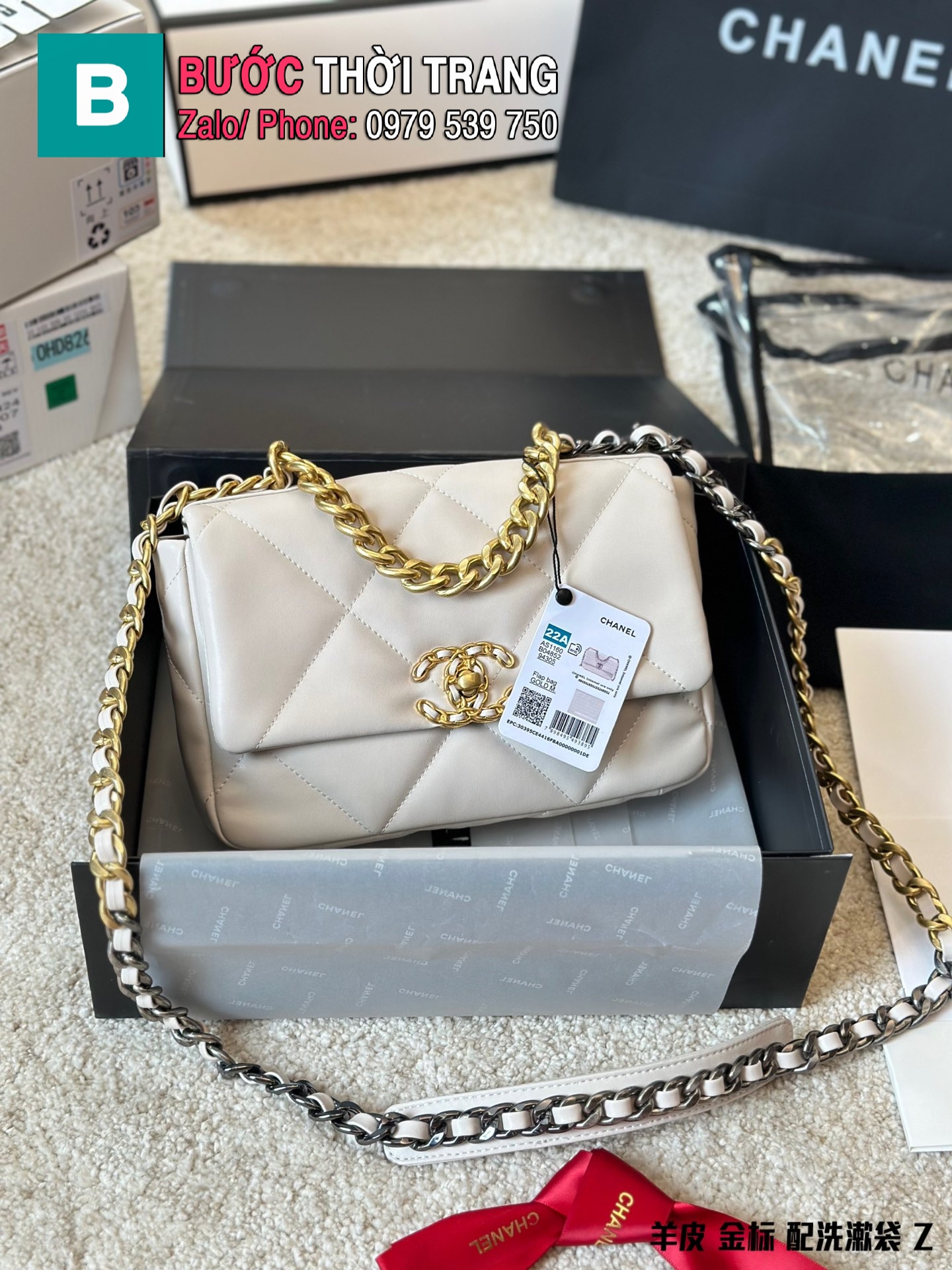 Chiếc Chanel 19 da cừu trắng với logo vàng nổi bật mang đến vẻ mềm mại, nhẹ tay và sang trọng đặc trưng. Chất liệu da cừu mềm mịn kết hợp họa tiết đại quilt tạo nên diện mạo trẻ trung nhưng vẫn đầy khí chất. Thiết kế hỗ trợ ba kiểu đeo linh hoạt: đeo chéo, đeo vai hoặc cầm tay. Dây đeo phối ba tông kim loại cổ điển giúp chiếc túi trở nên nổi bật hơn bao giờ hết. Đây cũng là mẫu được nhiều ngôi sao và đại sứ Chanel yêu thích. Kích thước 26cm, đi kèm trọn bộ hộp quà tặng.
