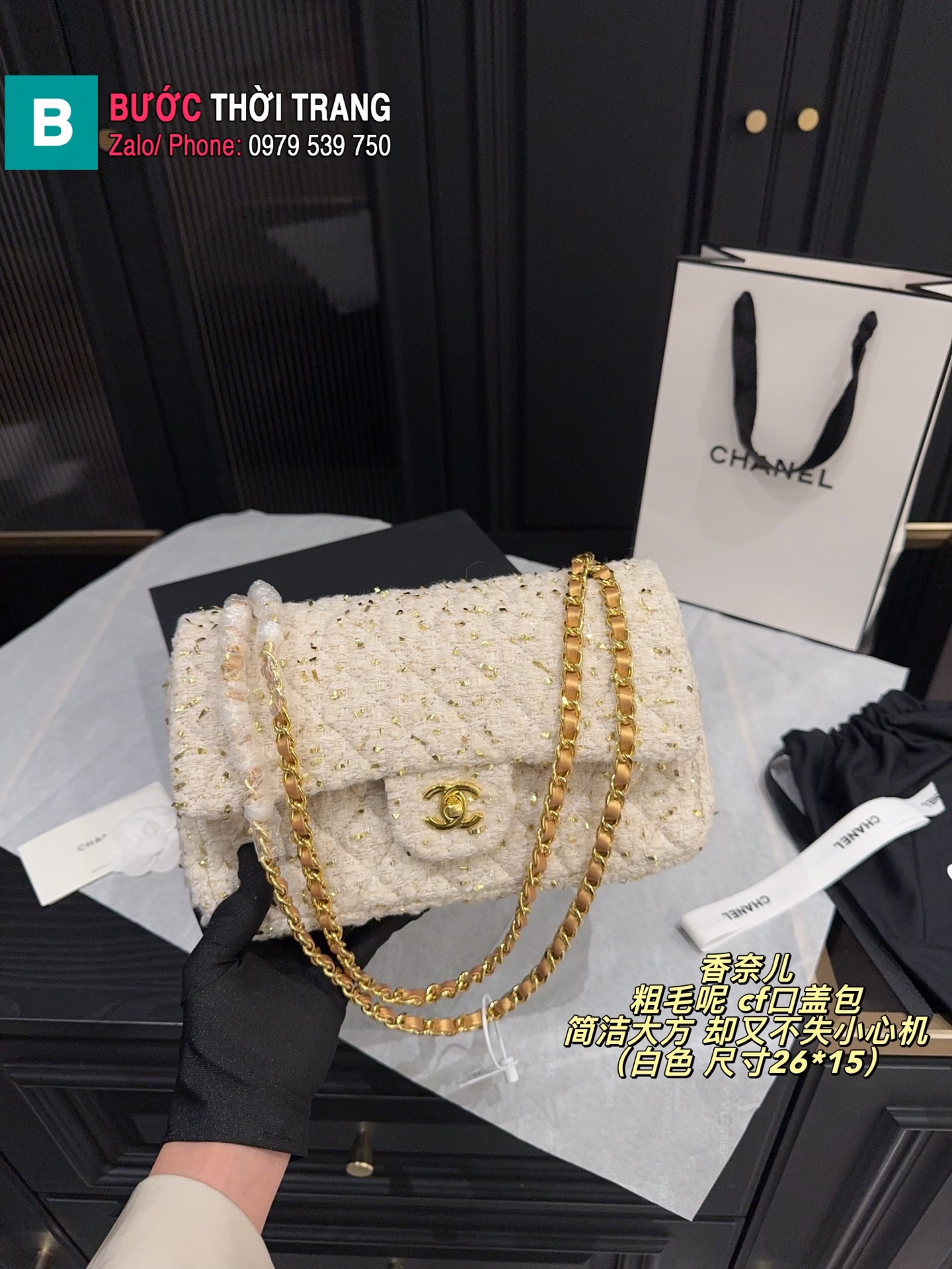 Túi xách đeo chéo CN cf màu vàng nude size 26×15 cm chất liệu vải dạ tweed