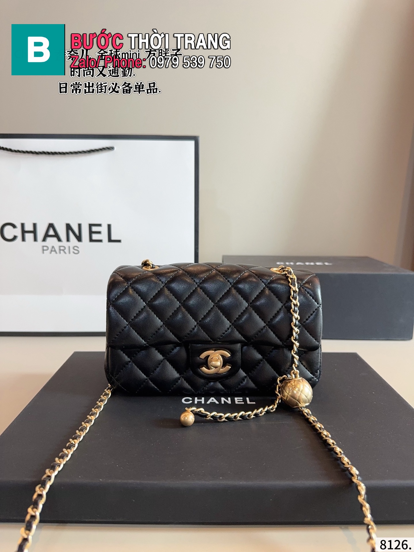 Túi xách đeo chéo CN CF mini màu đen da mềm size 20x6x11 cm
