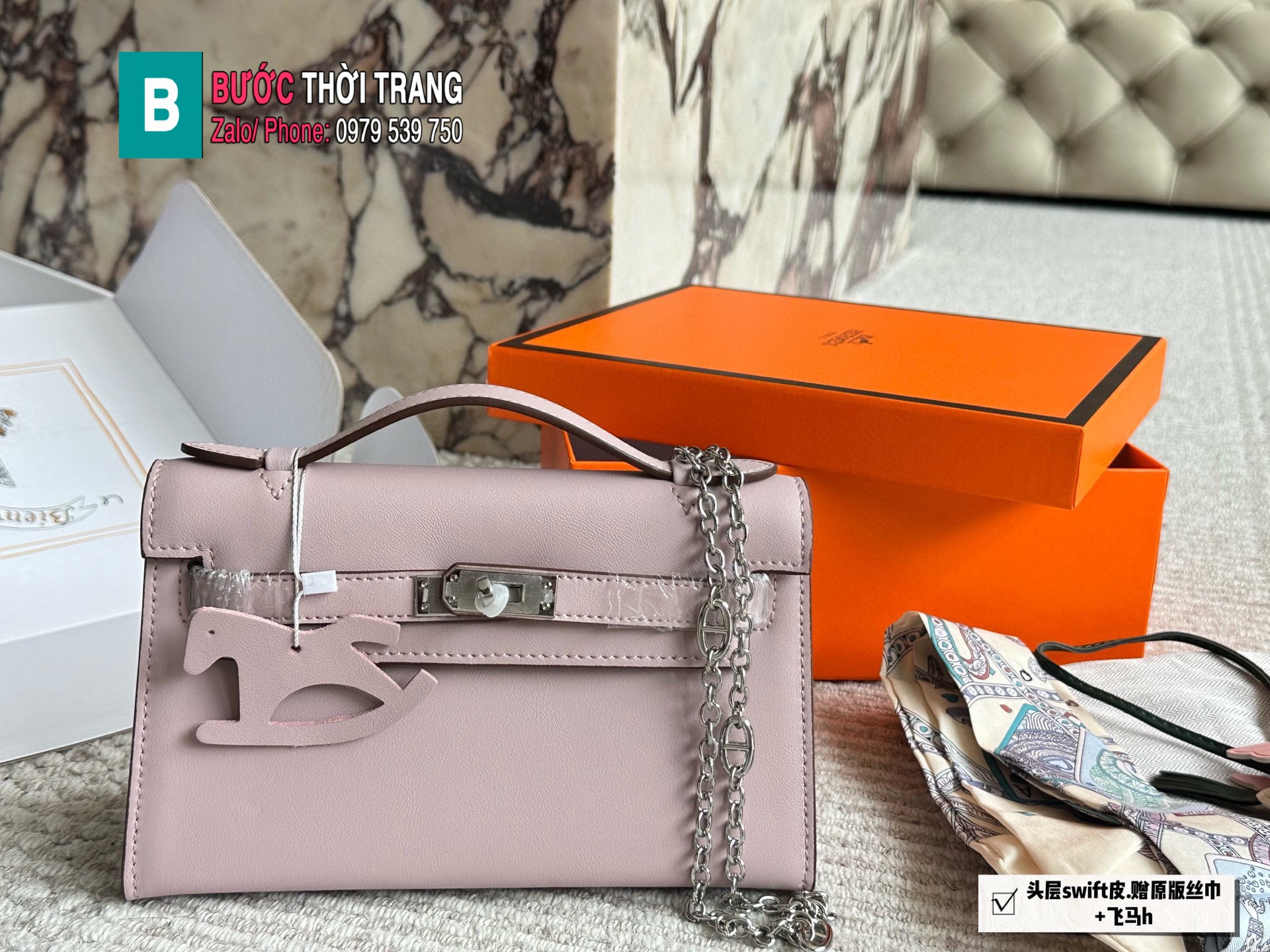 Túi xách đeo chéo HM kelly màu hồng nhạt size 22×13 cm phiên bản da bê Swift với khóa bạc tinh tế