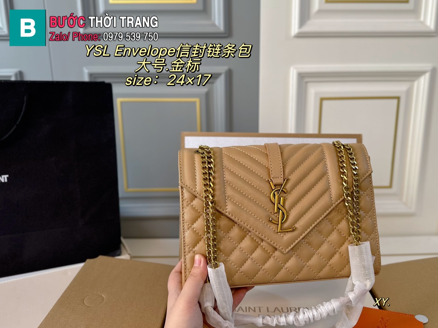 Túi xách đeo chéo YSL envelope màu nâu da hạt bền bỉ dây đeo vàng sáng nổi bật
