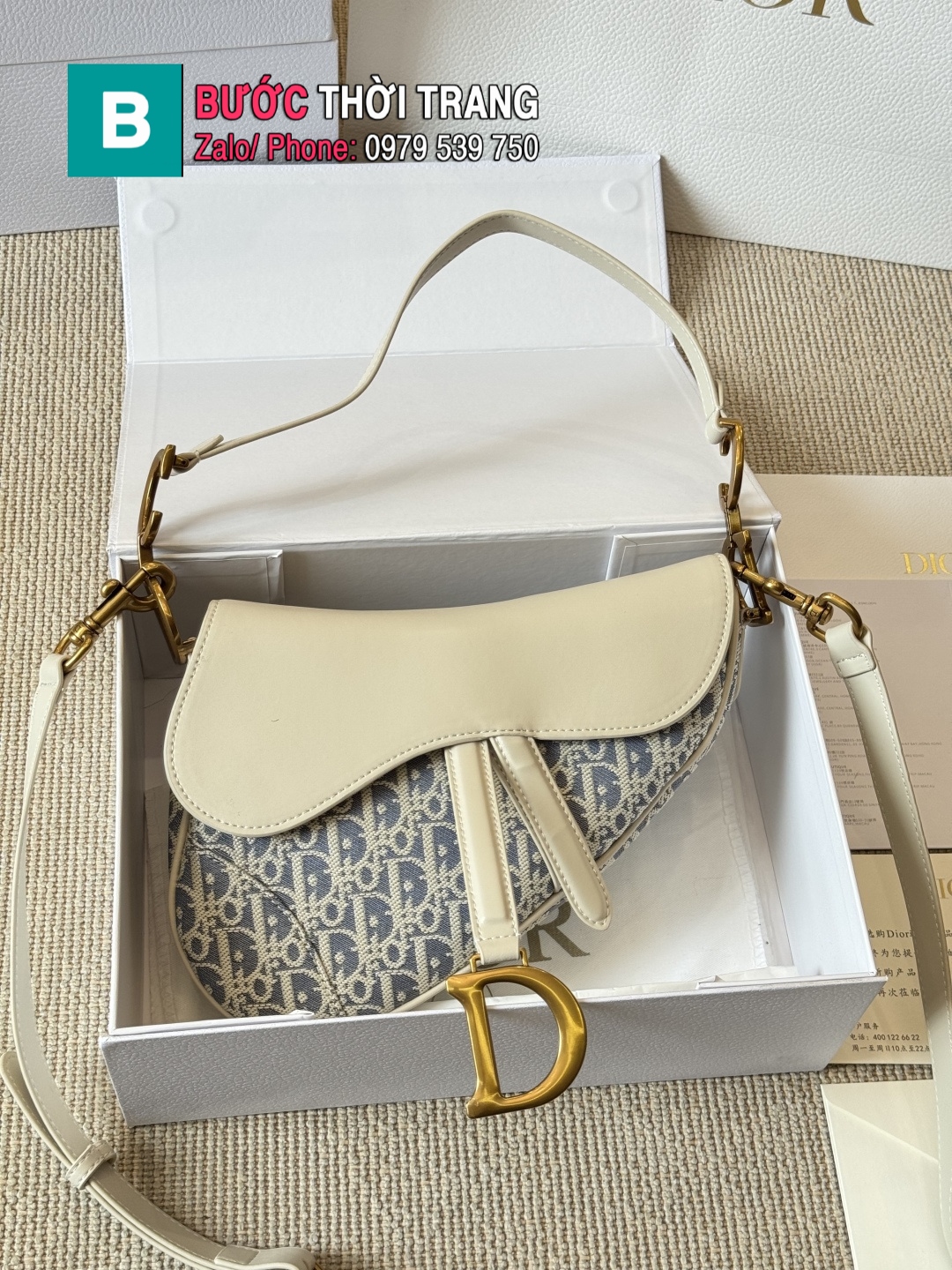 Túi xách Dior saddle màu ghi trắng size 25×20 cm nắp da trắng tag vàng sang trọng