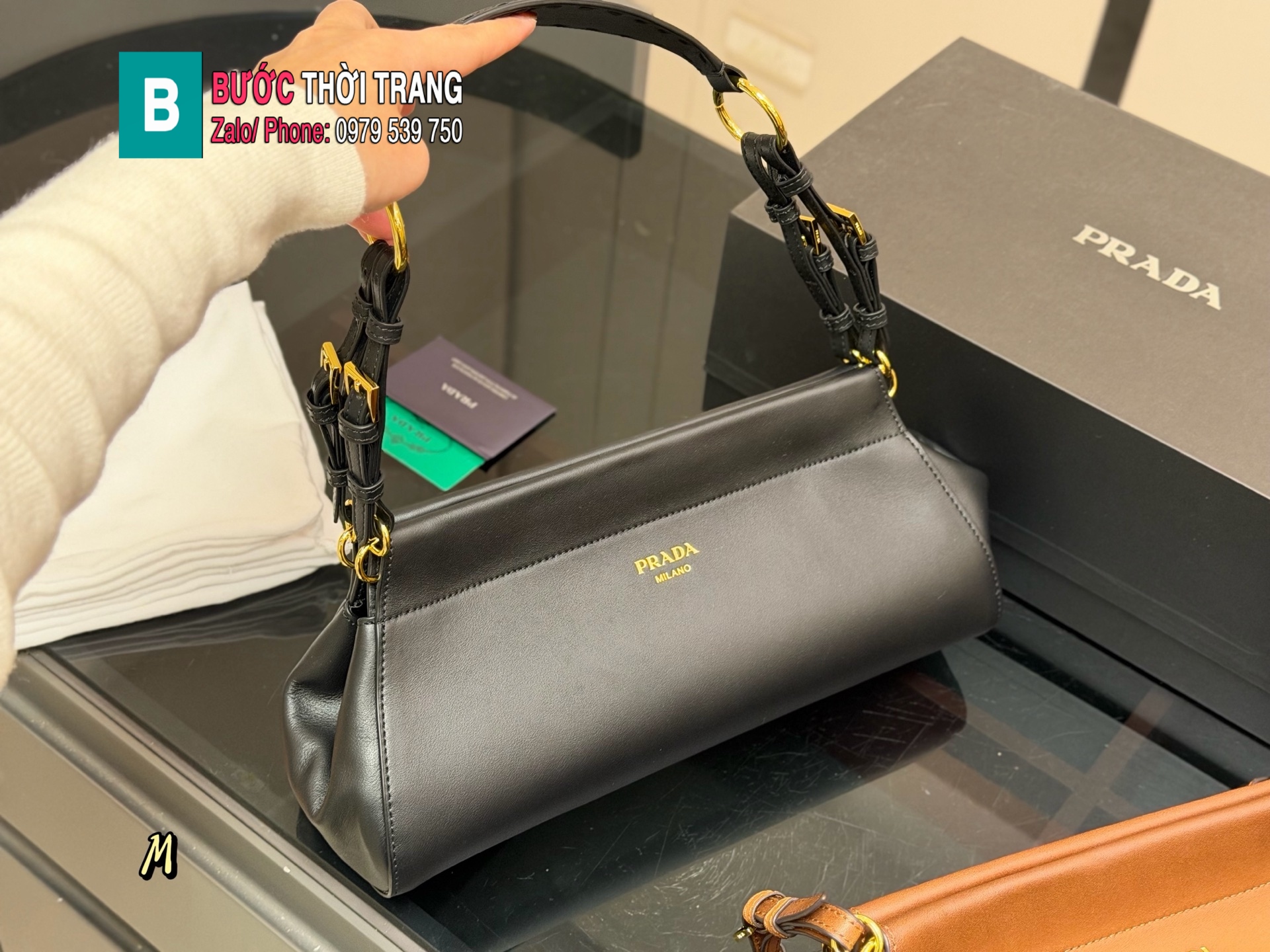 Túi xách kẹp nách Prada hobo size 32×15 cm màu đen da bò