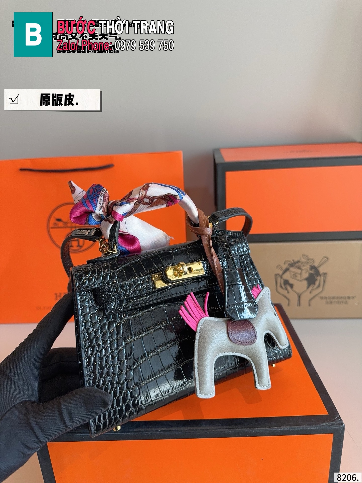 Túi xách nữ HM Kelly màu đen dập vân da cá sấu size 19 cm